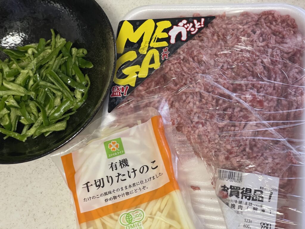 冷蔵庫に残っていたのは、昨日の余りもの・牛豚の合い挽き肉。