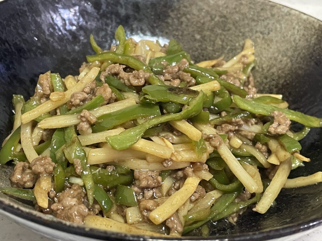 玉ねぎのみじん切りで泣いた過去を思い出しつつ、なんとかピーマン山盛り完成。
