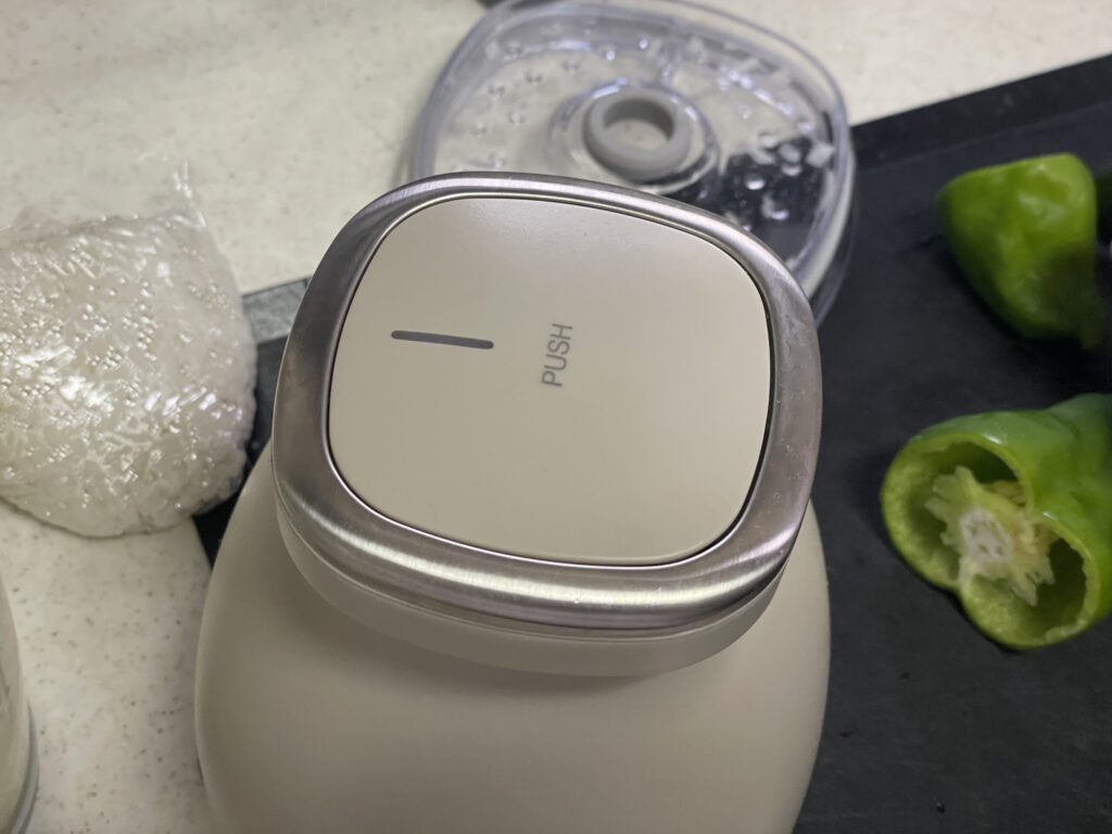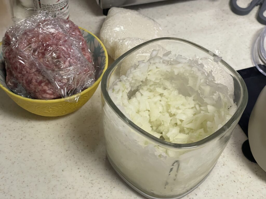 玉ねぎとピーマンは手作業じゃなく、シャカシャカ回すみじん切りマシンで一気に。文明の利器って本当に助かるよね。