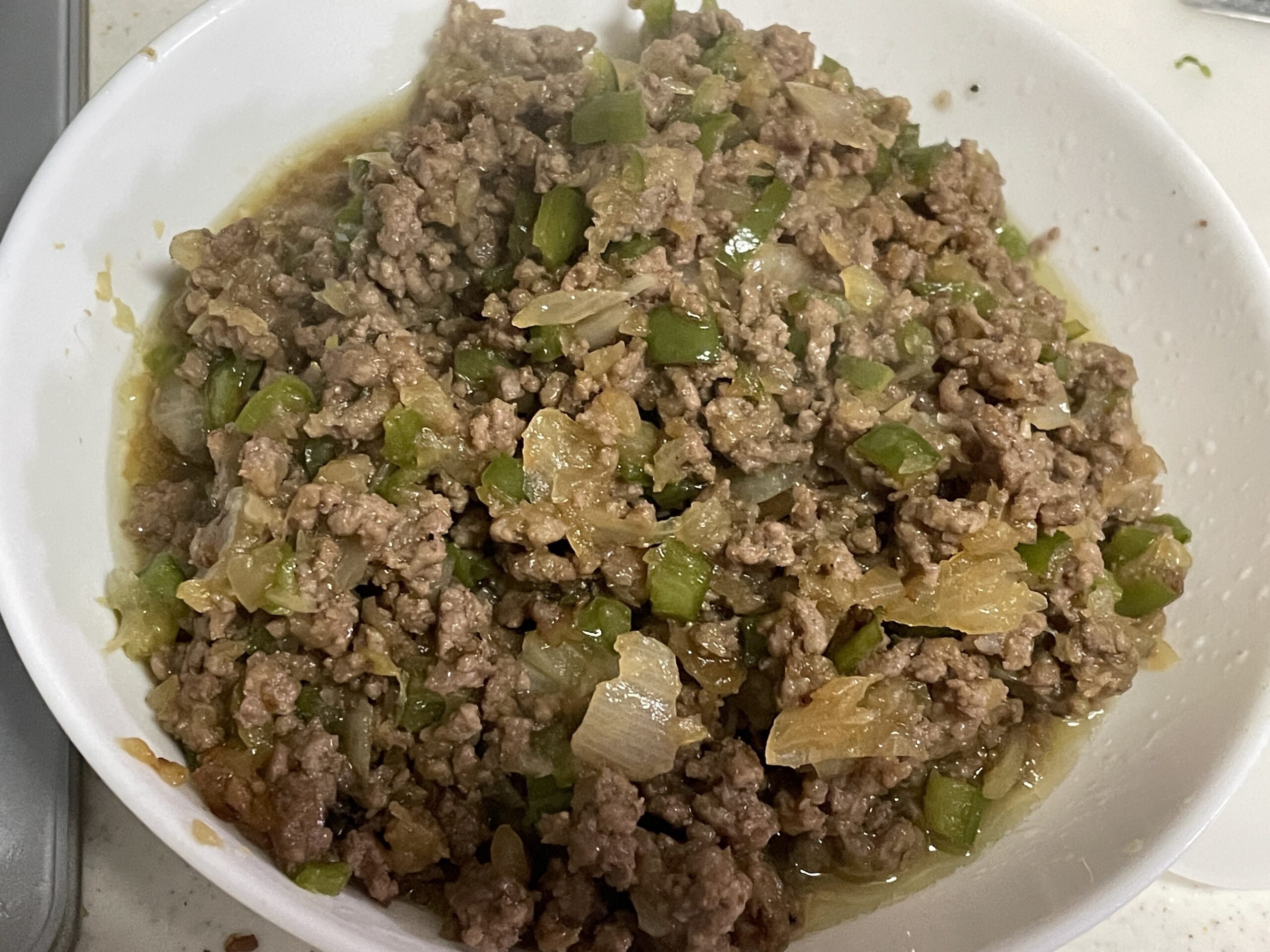 冷蔵庫を開けると、ちょうど使い切りたい冷凍合い挽き肉300g。それに妻の実家からもらったピーマンと玉ねぎもある。